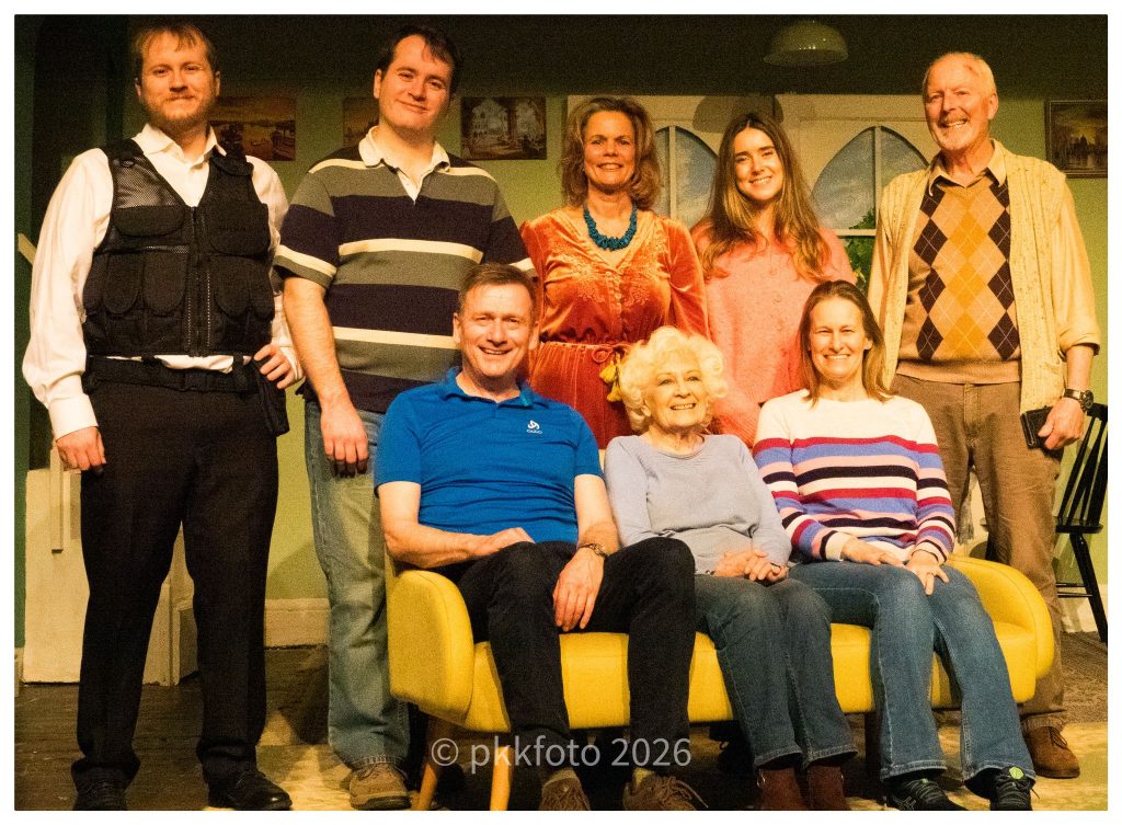 The cast of Wargrave Theatre’s THE UNFRIEND. L to R: Conor Black, Aidan Black, Graham Wheal, Sara Beazley, Ann Roberts (Director), Rhianna Inman, Jo Cole, and Henry Marchant.